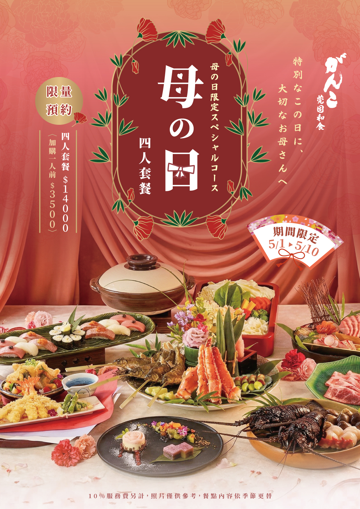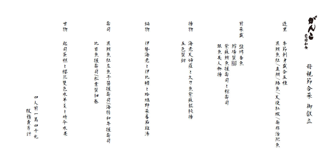 感謝之饗・母の日花宴 2026 母親節限定會席料理|四人前 NT$14,000 販售期間|5/1 ~ 5/10 即日起開放預約 獻給,此生最值得敬重與珍藏的存在 在這一年之中最重要的日子 以一席極致講究的會席料理 細膩表達對母親的感謝與心意 莞固和食 以正統關西會席為本 融合節氣旬味與職人技法 鋪陳一場專屬於母親節的尊榮饗宴 由がんこ總料理長 笠原隆昌 監製 以頂級山海食材,構築層層遞進的味覺體驗